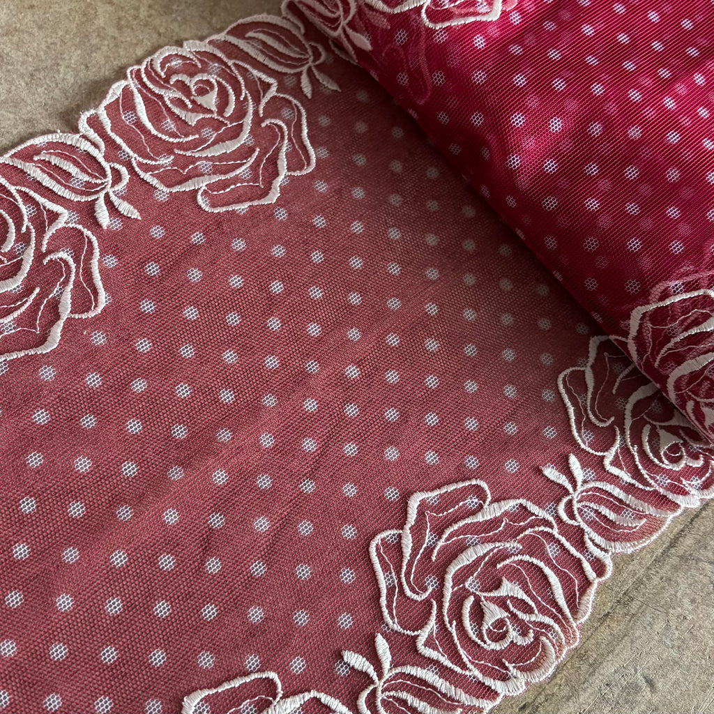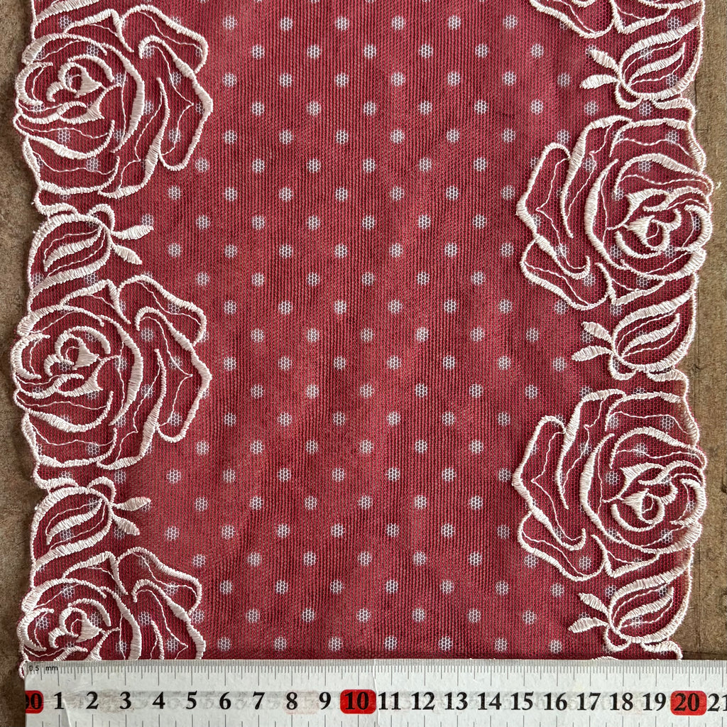 Beautiful, delicate Red & Cream Rose & Spotty pattern Galloon Embroidery. Perfect for Lingerie and nightwear