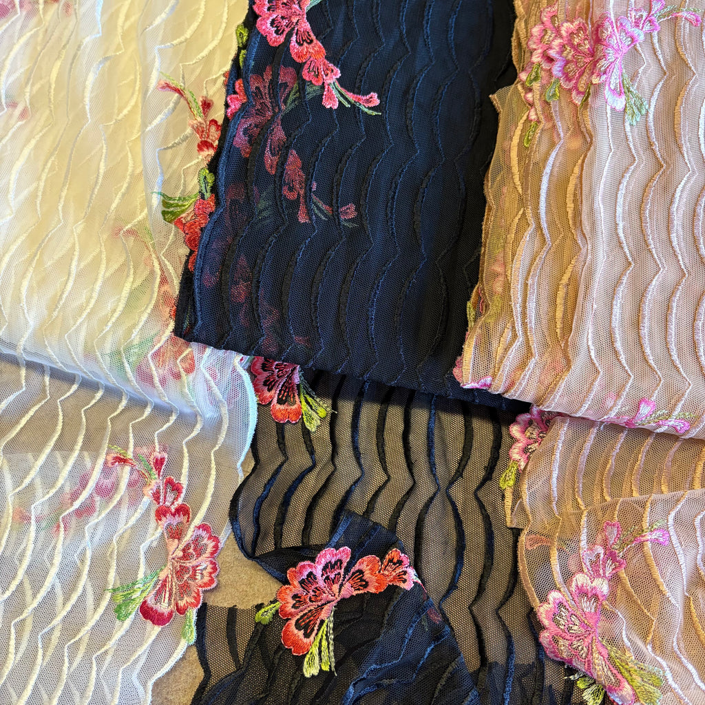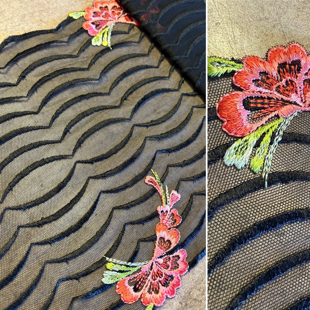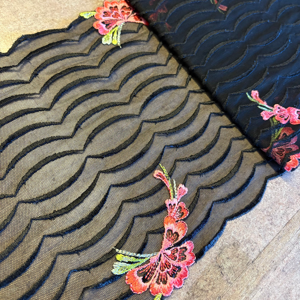 Expertly crafted with an elegant "Wave" Ripple pattern embellished with Floral embroidery and available in Ivory, Black & Beige Skin colors, this Embroidery edging is ideal for both Lingerie and nightwear. Its delicate design adds a touch of quality to any garment.