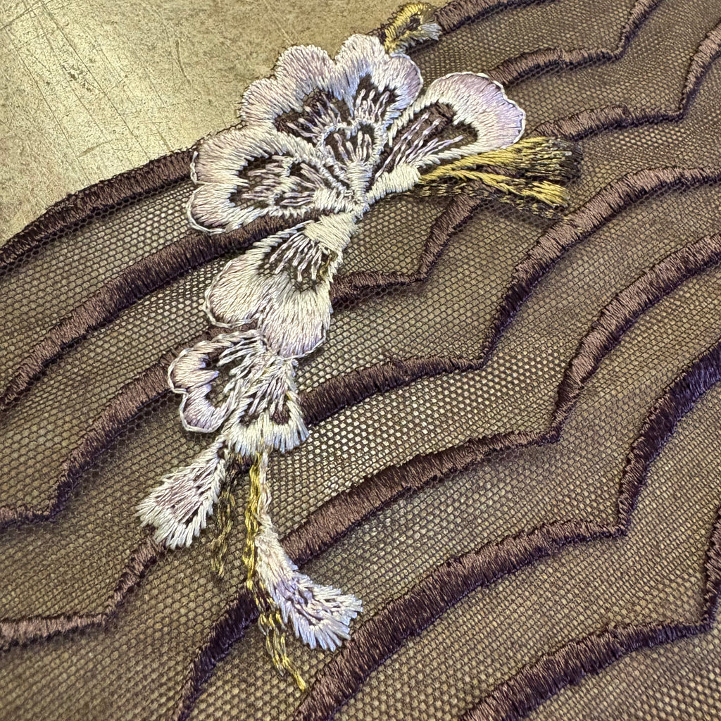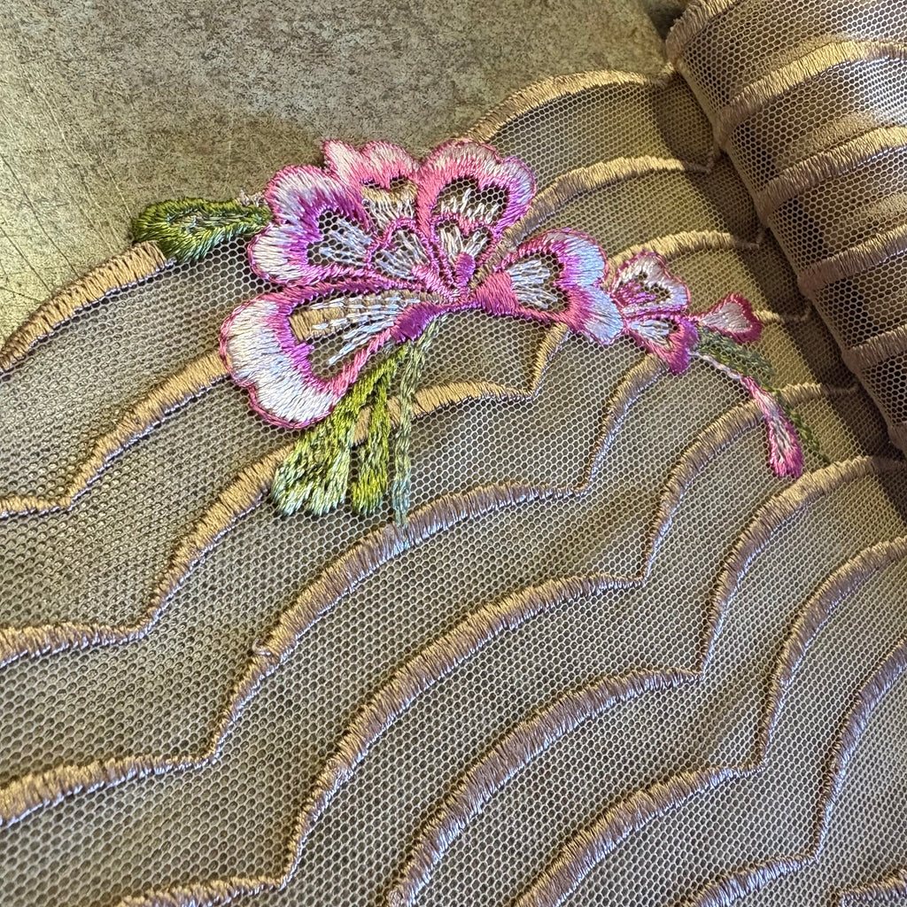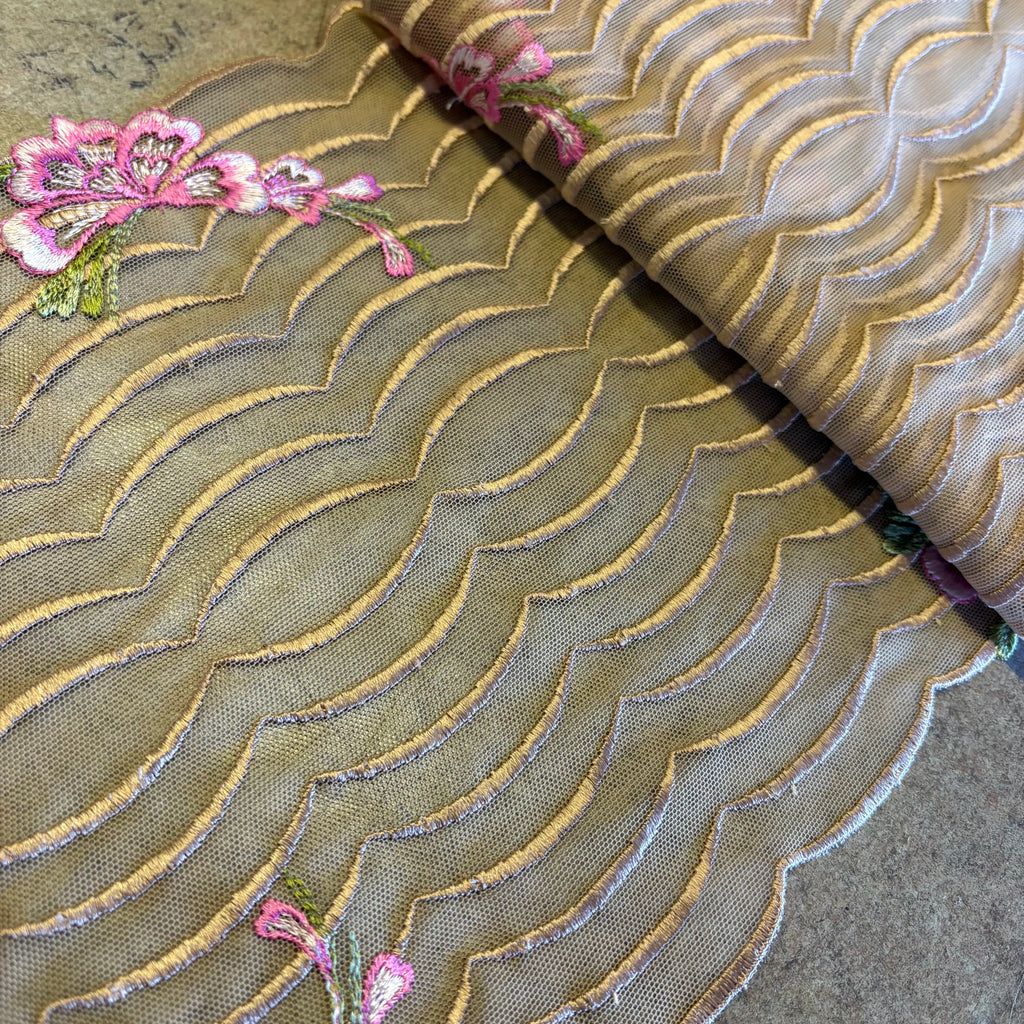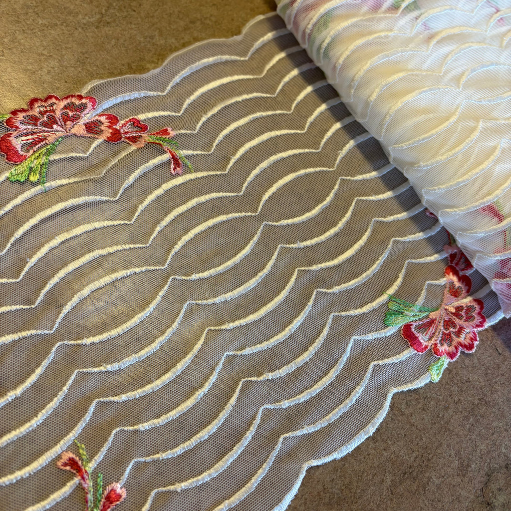Expertly crafted with an elegant "Wave" Ripple pattern embellished with Floral embroidery and available in Ivory, Black & Beige Skin colors, this Embroidery edging is ideal for both Lingerie and nightwear. Its delicate design adds a touch of quality to any garment.